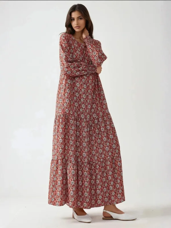 Design: Gevoerde zoom/rand; Materiaal: Viscose; Halstype: Uitgesneden hals; Motief: Bloemenprint; Details: Ruches, Volant, Gedrapeerd; Extra's: All-over patroon; Lengte: Lang/maxi; Snit: Uitlopend; Pasvorm: Losse pasvorm; Armlengte: Lange mouw