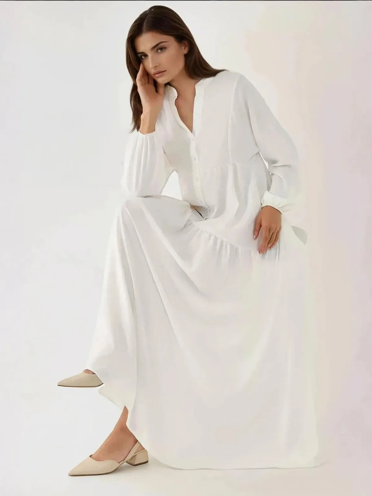Design: Gevoerde zoom/rand; Type sluiting: Knoopsluiting; Halstype: V-hals; Motief: Effen; Kraag: Tuniek kraag; Details: Volant, Gedrapeerd; Extra's: Op staal naden; Lengte: Lang/maxi; Snit: Uitlopend; Pasvorm: Wijde pasvorm; Armlengte: Lange mouw