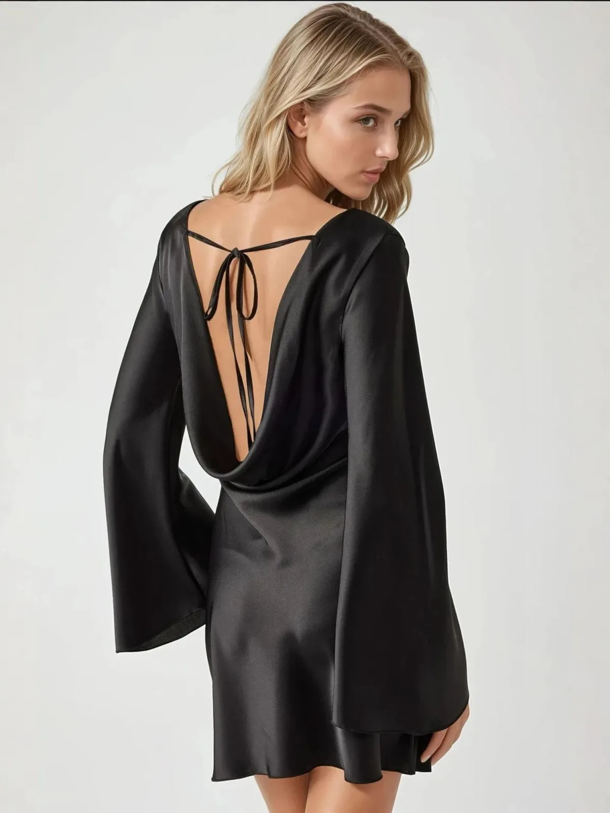 Design: Om te knopen/binden; Materiaal: Satijn; Halstype: Boothals; Motief: Effen; Details: Plooien, Backless; Extra's: Op staal naden; Lengte: Kort/mini; Snit: Getailleerd; Pasvorm: Normale pasvorm; Armlengte: Lange mouw