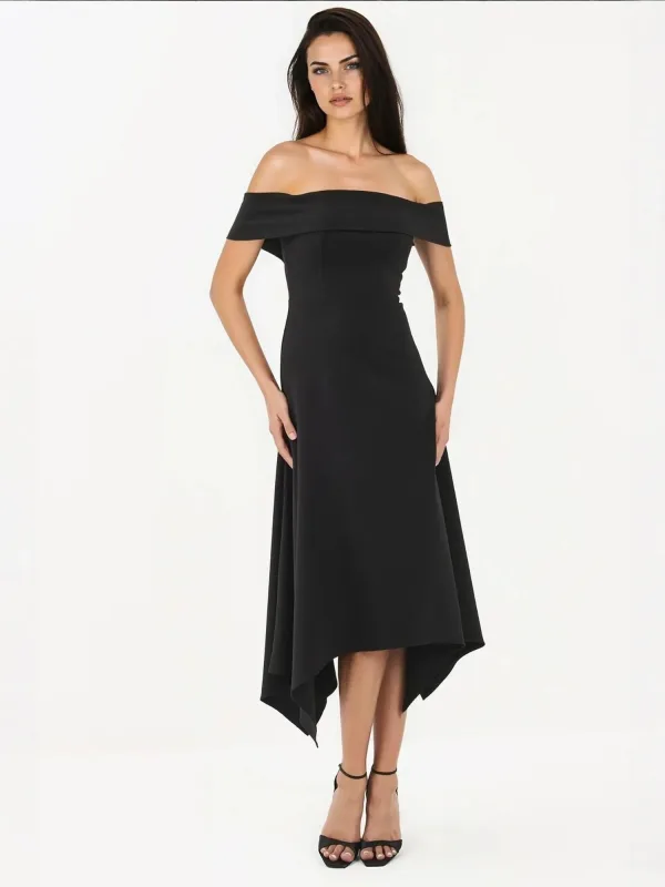 Design: Strapless/off-shoulder; Type sluiting: Ritssluiting; Halstype: Carmen hals; Motief: Effen; Extra's: Op staal naden; Lengte: 3/4 lengte; Snit: Getailleerd; Pasvorm: Normale pasvorm; Armlengte: Kwartmouw