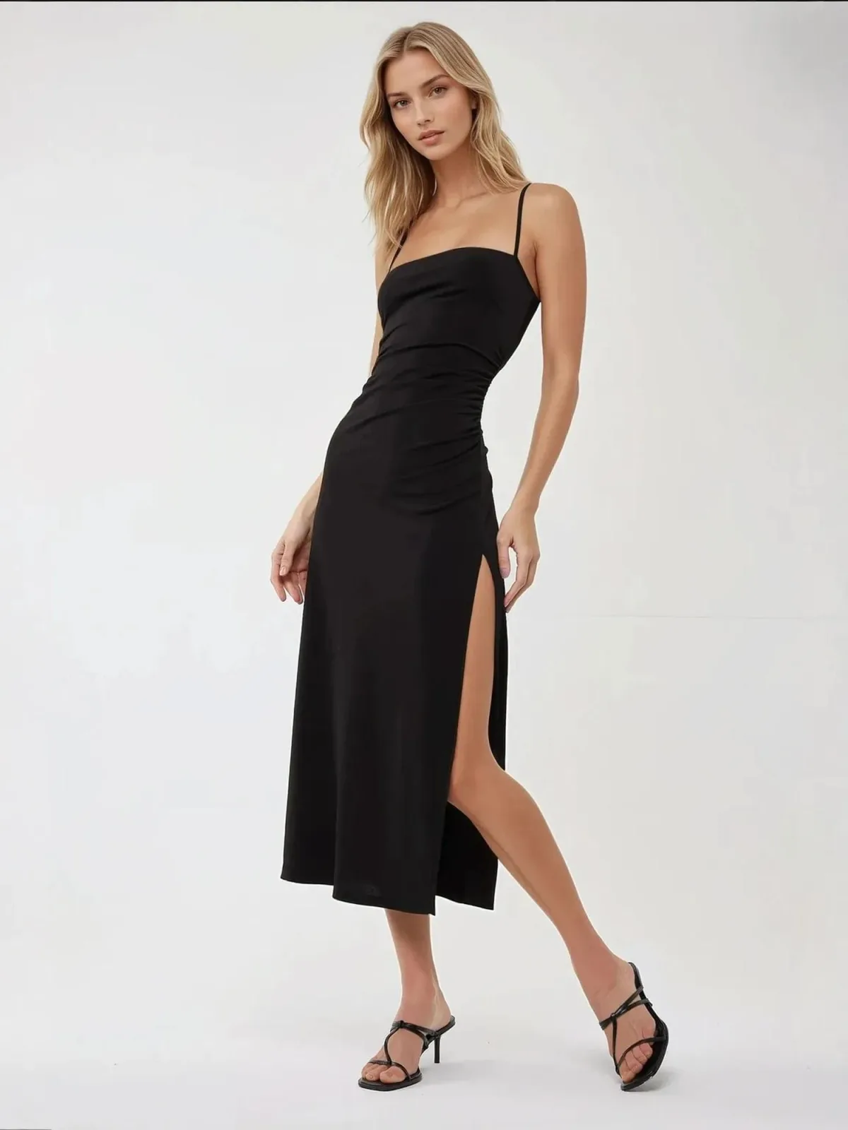 Design: Gevoerde zoom/rand; Halstype: Carréhals; Motief: Effen; Soort bandjes: Spaghettibandjes; Details: Gedrapeerd; Extra's: Gladde stof; Lengte: 3/4 lengte; Snit: Figuur omarmend; Pasvorm: Slanke pasvorm; Armlengte: Mouwloos