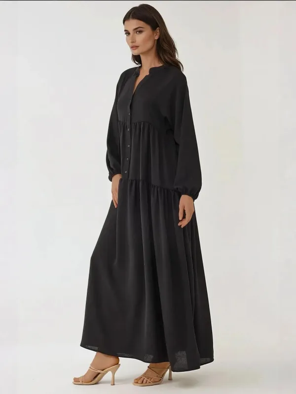 Design: Gevoerde zoom/rand, Knop placket; Type sluiting: Knoopsluiting; Halstype: V-hals; Motief: Effen; Kraag: Tuniek kraag; Details: Volant, Gedrapeerd; Extra's: Op staal naden, Gladde stof; Lengte: Lang/maxi; Snit: Uitlopend; Pasvorm: Wijde pasvorm; Armlengte: Lange mouw