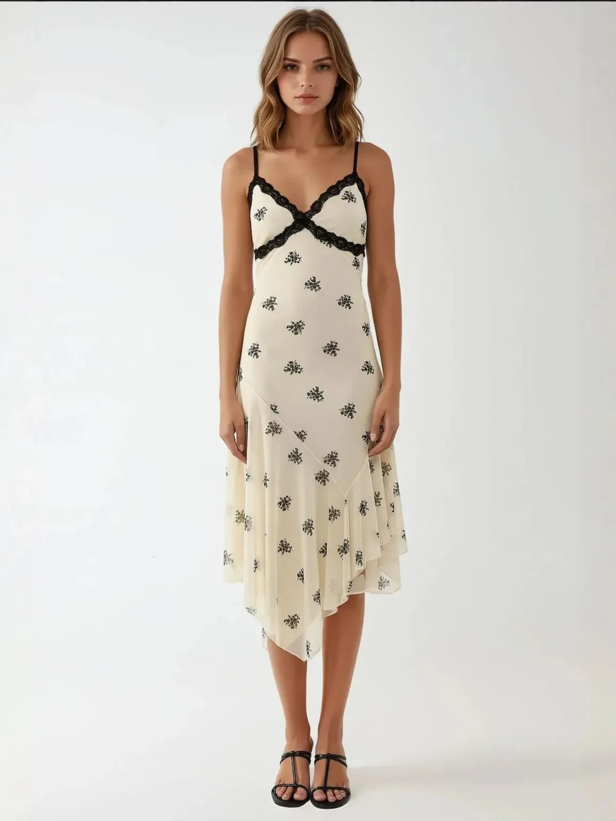 Design: Diepe snit/decolleté, High-low zoom; Halstype: V-hals; Motief: Bloemenprint; Soort bandjes: Spaghettibandjes; Details: Kant, Volant; Extra's: Verstelbare bandjes, All-over patroon; Lengte: 3/4 lengte; Pasvorm: Normale pasvorm; Armlengte: Mouwloos