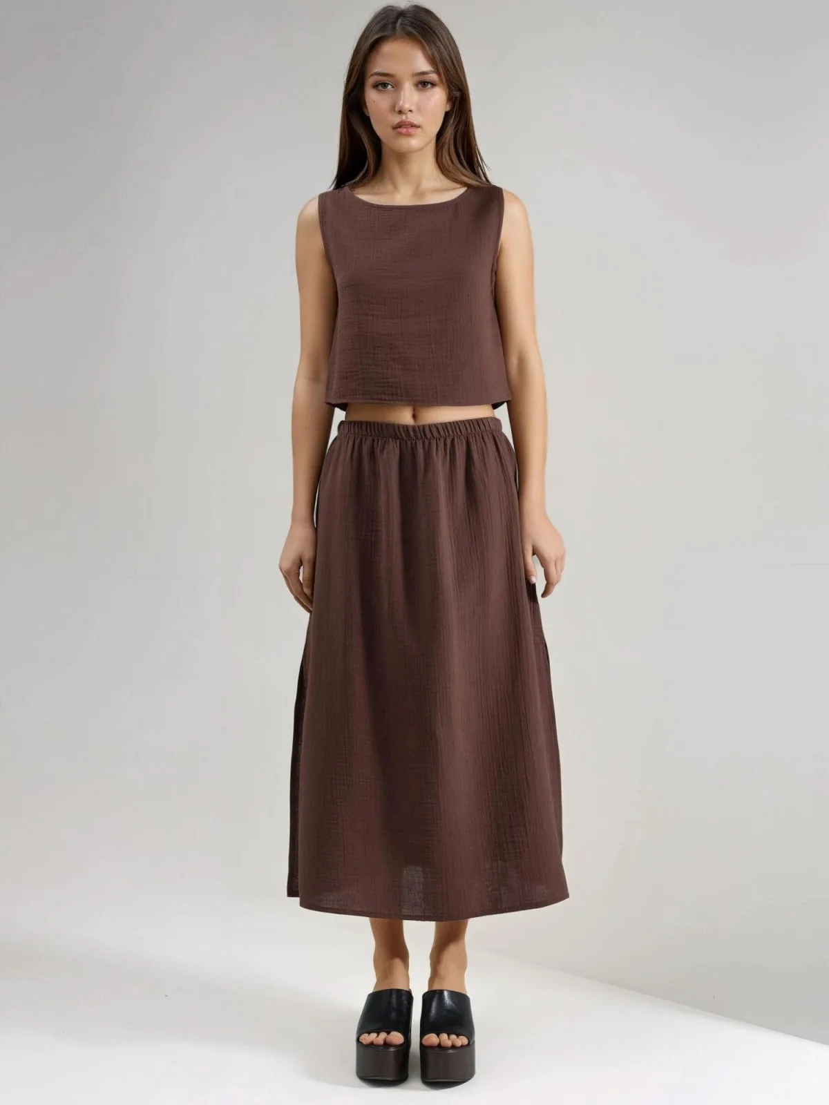 Design: Gevoerde zoom/rand, Elastische taille/zoom, Zijdelingse inkepingen; Type sluiting: Slip; Voering: Niet gevoerd; Materiaal: Katoen; Motief: Effen; Kraag: Zonder kraag; Details: Gedrapeerd; Extra's: Op staal naden, Crinkle look; Lengte: 7/8 lengte; Pasvorm: Normale pasvorm; Armlengte: Mouwloos; Taillehoogte: High waist