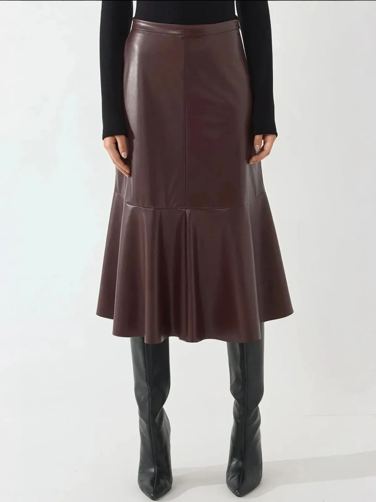Design: Recht model; Materiaal: Imitatieleder; Motief: Effen; Rokvorm: A-lijn rok; Details: Volant; Extra's: Op staal naden, Gladde stof; Lengte: 3/4 lengte; Pasvorm: Normale pasvorm