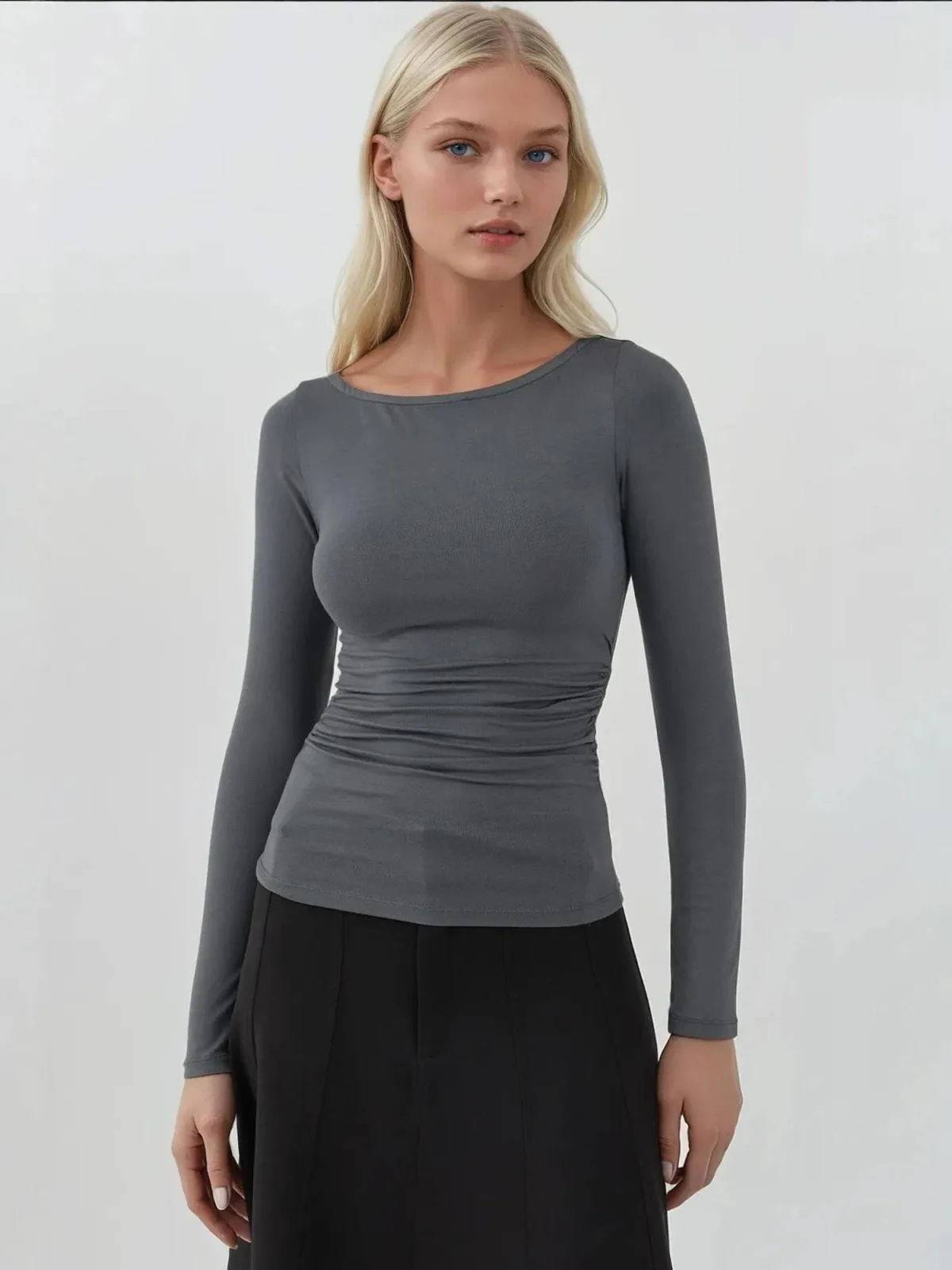 Design: Gevoerde zoom/rand; Materiaal: Jersey; Halstype: Boothals; Motief: Effen; Details: Gedrapeerd; Extra's: Koele grip; Pasvorm: Slanke pasvorm; Armlengte: Lange mouw; Lengte: Normale lengte