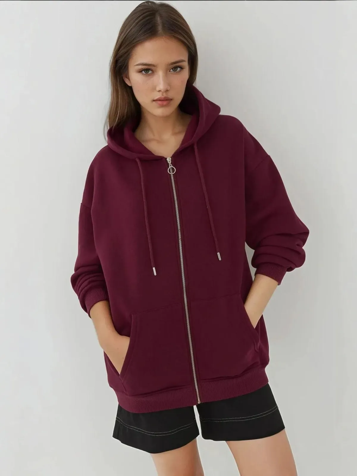 Design: Kangaroo zak; Type sluiting: Ritssluiting; Materiaal: Sweatstof; Halstype: Capuchon; Motief: Effen; Extra's: Op staal naden; Pasvorm: Losse pasvorm; Armlengte: Lange mouw; Lengte: Lange pasvorm