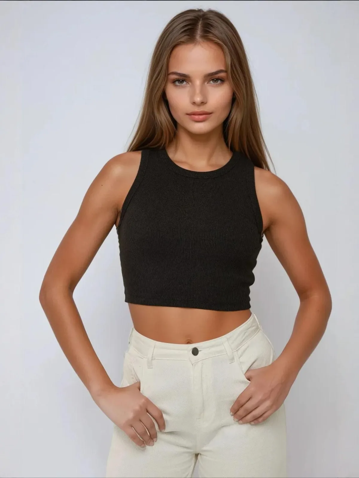 Design: Geribbeld gebreid, Ingelegde kraag; Materiaal: Jersey; Halstype: Ronde hals; Motief: Effen; Soort bandjes: Brede bandjes; Extra's: Op staal naden, Voelt zacht aan; Pasvorm: Slanke pasvorm; Armlengte: Mouwloos; Lengte: Korte pasvorm