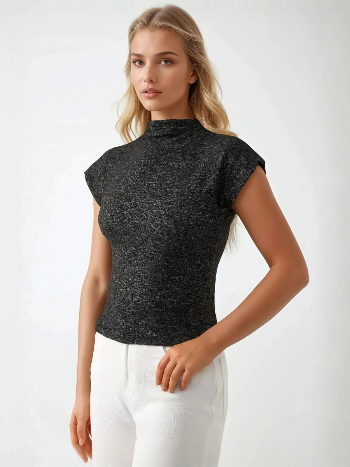 Design: Gesneden mouw, Rechte zoom; Materiaal: Knitwear; Halstype: Opstaande kraag; Motief: Mélange; Details: Gedrapeerd; Extra's: Fully fashioned, Met textuur; Pasvorm: Slanke pasvorm; Armlengte: Kwartmouw; Lengte: Normale lengte