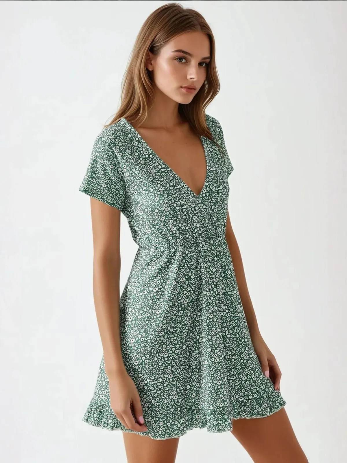 Design: Gevoerde zoom/rand, Diepe snit/decolleté, Wikkel-look; Materiaal: Viscose; Halstype: V-hals; Motief: Bloemenprint; Details: Gedrapeerd; Extra's: All-over patroon; Lengte: Kort/mini; Snit: Getailleerd; Pasvorm: Normale pasvorm; Armlengte: Kwartmouw