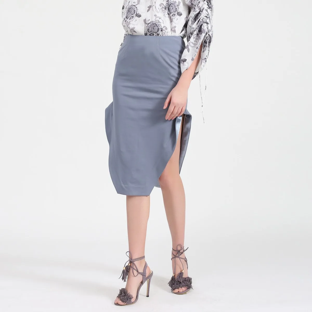 Een verleidelijke snit, dit stuk biedt openingen aan de zijkanten subtiel de benen onthullen. High-end afwerkingen met satijnen versieringen door de zoom verbeterd met gouden vooringenomenheid. Combineer met een shirt of blouse voor een verfijnde look. • Vorm: potlood met ruches die aan de zijkanten opduiken • Lengte: 75 cm • Invisible Zipper Center Back