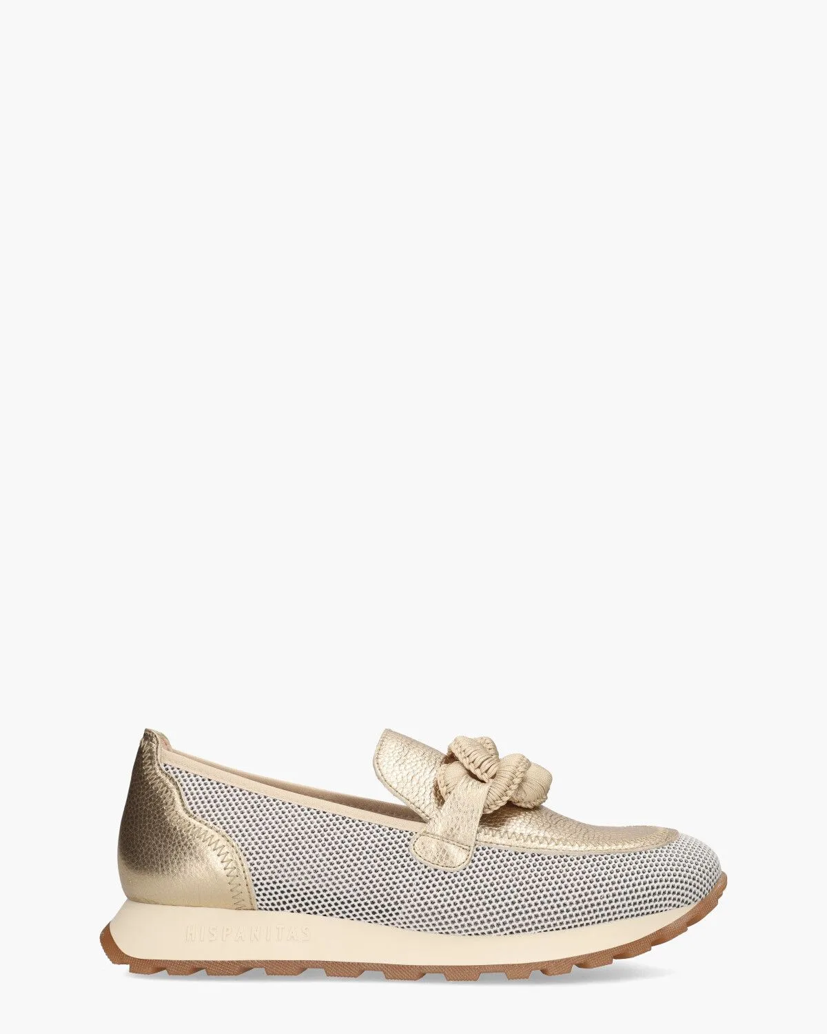 Loafers voor dames BHV243270 uit de collectie van het Spaanse merk Hispanitas. Dit model heeft een upper van gerecycled mesh en gestructureerd leer in een gouden tint. De matching goudkleurige raffia chain op de wreef geeft de loafers een extra zomerse look. Op de off-white/bruine rubberen zool met een grof profiel staat het merklogo. De
