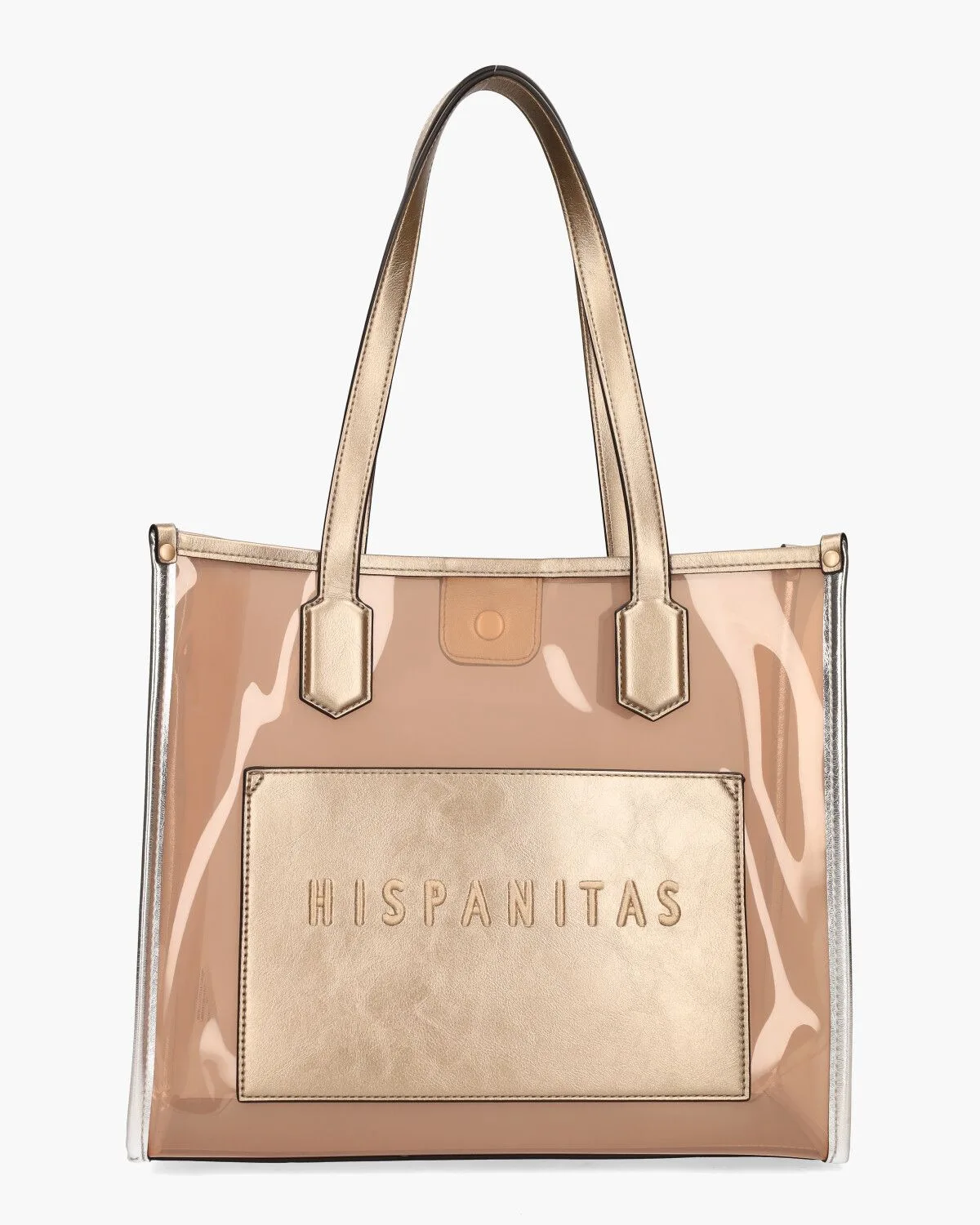 Deze ruime shopper BV243257 uit de collectie van Hispanitas is een absolute eyecatcher, vervaardigd van taupekleurig transparant vinyl en zilverkleurig kunststof. Aan de voorkant pronkt de tas met een groot Hispanitas-logo. Binnenin beschikt dit model over een groot compartiment met een kleiner zilveren afneembaar ritstasje. De gouden