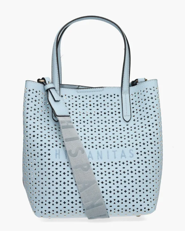 Deze lichtblauwe shopper van Hispanitas BV253972 is een stijlvolle en ruime tas. Het gelaserde imitatieleer voelt luxe aan, terwijl het ton-sur-ton geborduurde logo op de voorkant zorgt voor een subtiel statement. Binnenin biedt het hoofdvak genoeg plek voor je dagelijkse spullen, met een extra ritsvak voor losse items. Draag’m in de hand