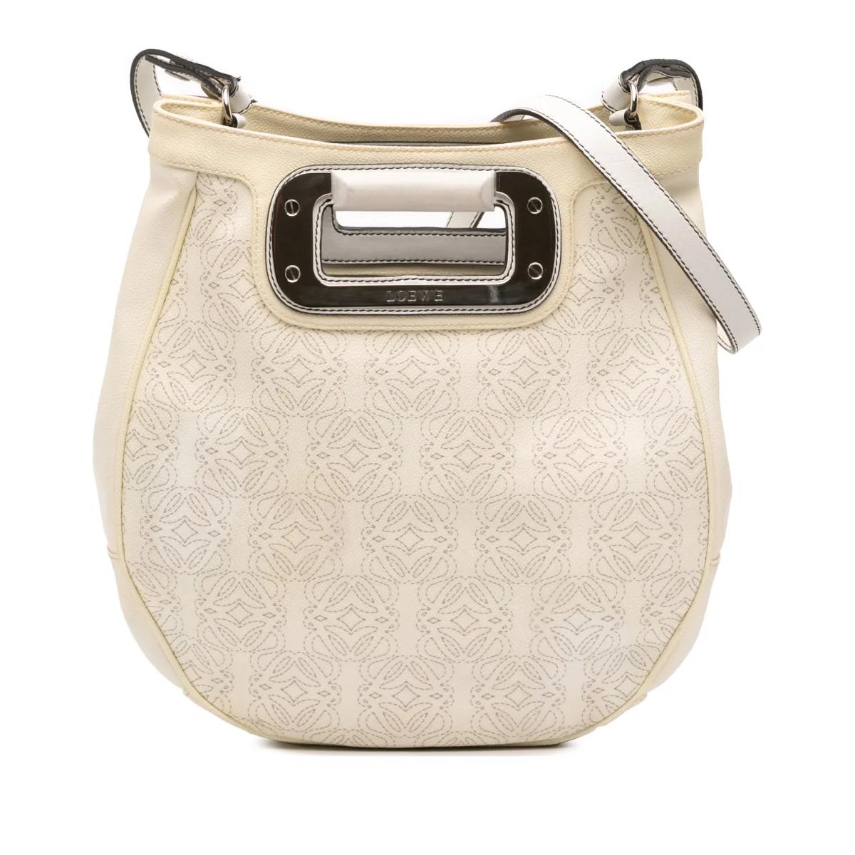 Draag moeiteloos, reis stijlvol, leef spontaan. Deze tweedehands LOEWE Anagram leren schoudertas biedt iconische stijl en handsfree gemak. Het hobo-tas ontwerp zorgt ervoor dat het comfortabel tegen je lichaam aan zit, waardoor het ideaal is voor drukke dagen. Het ecru leer, versierd met het Anagram-patroon, biedt duurzame, onderhoudsvriendelijke draagbaarheid. De bovenste rits houdt je essentials veilig. De metalen handgreep voegt een vleugje verfijning toe. Perfect om een vleugje vintage aan elke outfit toe te voegen. Afmetingen: 34 x 33 x 15 cm Conditiebeoordeling: B+ Informatie over de conditie: Buitenzijde achterzijde verkleurd. Buitenzijde achterzijde bevlekt met andere. Buitenzijde onderkant verkleurd en versleten. Buitenzijde onderkant bevlekt met andere. Slot krasjes. Buitenste hoeken versleten. Buitenzijde voorkant verkleurd en versleten. Buitenzijde voorkant bevlekt met andere. Buitenste handgreep afgescheurd stiksel opnieuw geverfd. Binnenvoering bevlekt met andere. Praktische bevestiging krasjes. Buitenzijde zijkant verkleurd. Buitenzijde bovenkant verkleurd. Rits krasjes.