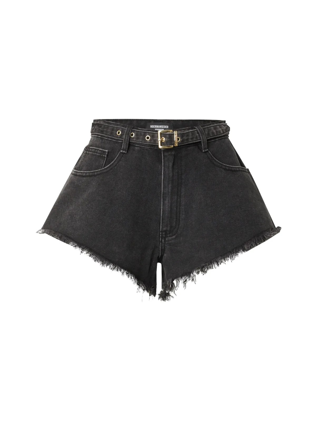 Design: 5-pocket-style, Tailleriem, Gesp; Type sluiting: Ritssluiting; Materiaal: Denim; Motief: Effen; Details: Franjes; Extra's: Label plaatje, Riemlussen; Lengte: Kort/mini; Pasvorm: Regular; Taillehoogte: High waist