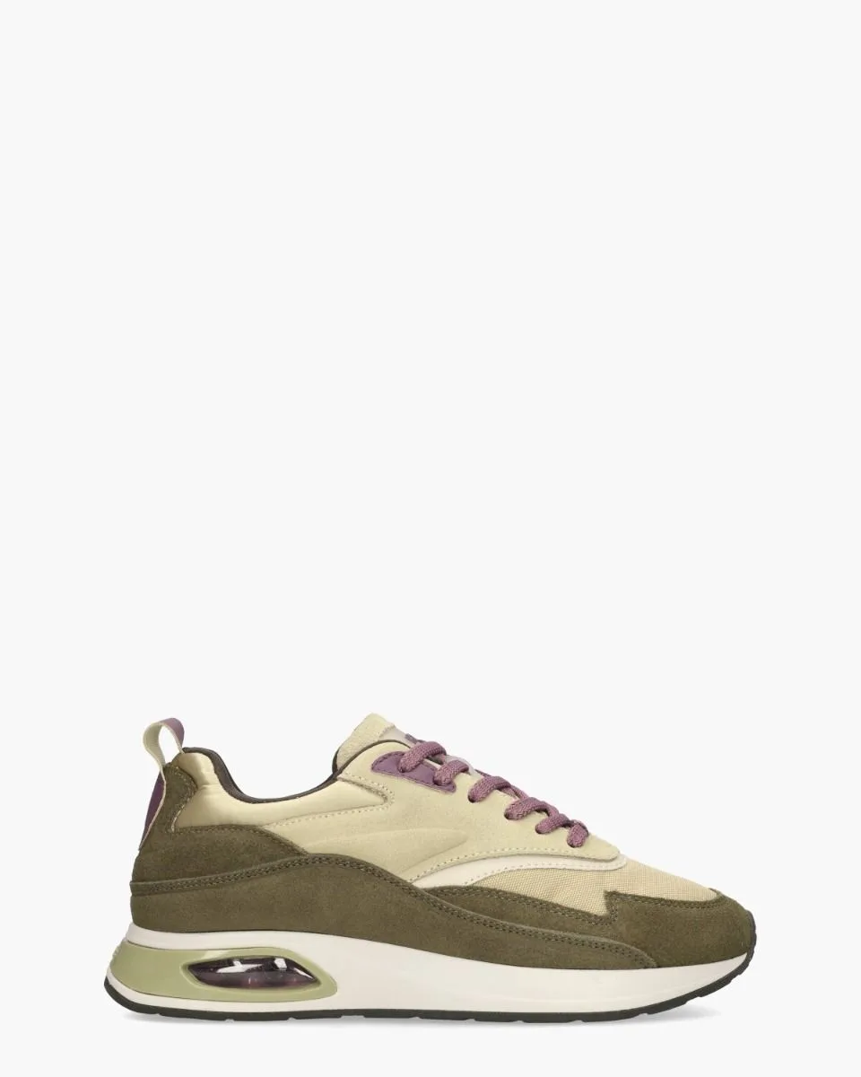 Sneakers voor dames, model Todai Ji, van het merk HOFF. Deze sneakers hebben een bovenwerk van suède, mesh en satijnen scubastof in diverse tinten, waaronder donkergroen, beige en taupe. Opvallende details zijn de paarse lederen accenten bij de veters en de hiel. De stoffen binnenzijde bevat een uitneembaar voetbed van memory foam. Branding