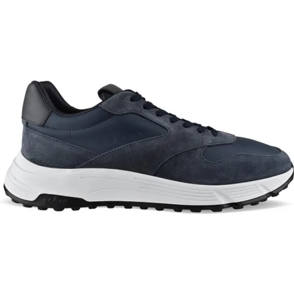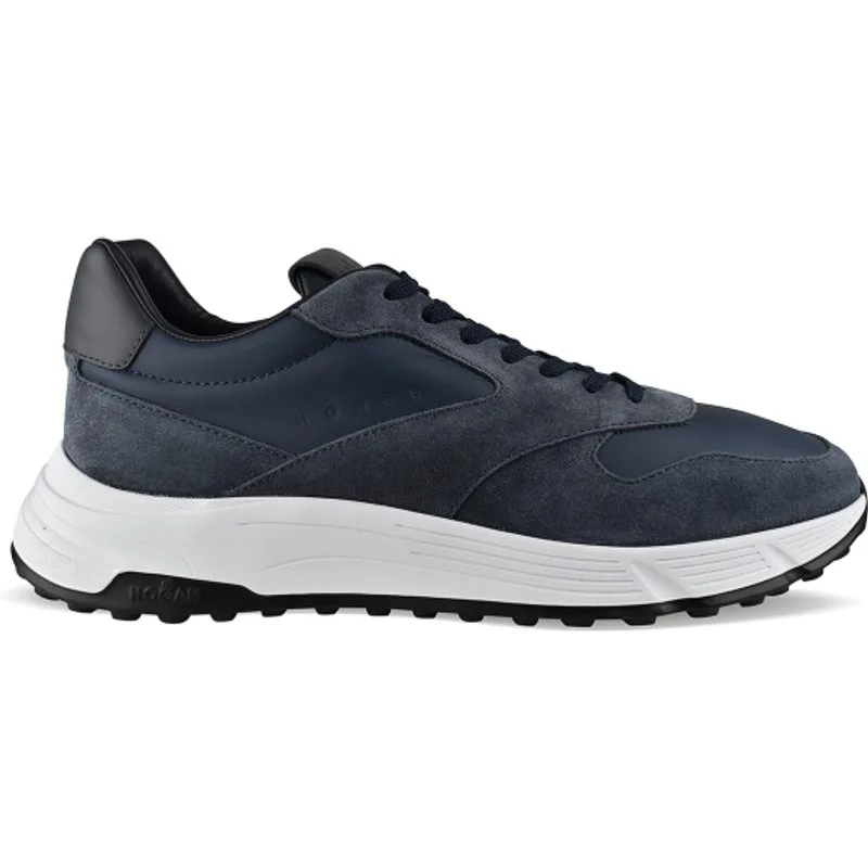 Sneakers Hyperlight Hogan marineblauw leer.marineblauwe suède inzetstukken.marineblauwe veters.reliëflogo op zichtbare zijde.voorste tong met zwarte logopatch.zwarte leren teller.witte en zwarte rubberen zool.Made in Italy.
