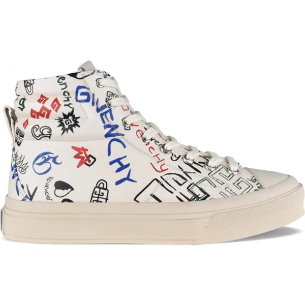 Hoge Givenchy City-sneakers in beige leer.Veelkleurige graffitiprint over de hele schoen.Gewatteerde verstevigingen rond de enkel.Gegraveerde metalen plaat van Givenchy op de hiel.Witte vetersluiting.Rubberen zool.100% kalfsleer.