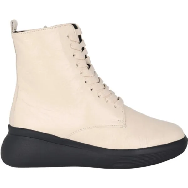 Crème leren enkellaarsjes zijn een spannende variant op de klassieke zwarte enkellaarsjes. Ze zijn perfect voor elke grijze herfstdag. De stevige plateauzool en de strakke vorm met zijn typische stretchstof inzetstukken kenmerken dit sportieve ontwerp.