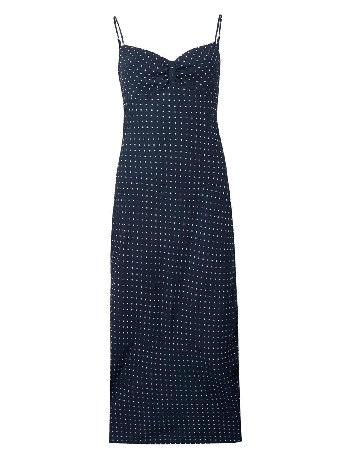 Design: Gevoerde zoom/rand, Diepe snit/decolleté; Materiaal: Crêpe; Halstype: V-hals; Motief: Gestippeld; Soort bandjes: Spaghettibandjes; Details: Cut-outs, Gedrapeerd, Backless; Extra's: Verstelbare bandjes, All-over patroon, Gladde stof; Lengte: 7/8 lengte; Snit: Getailleerd; Pasvorm: Slanke pasvorm; Armlengte: Mouwloos