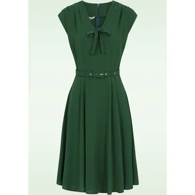 ''Green is the new WOW!" Deze prachtige swing jurk is uitgevoerd in een donkergroene, soepele en luchtige stof (stretcht niet!) met een afneembare riem in de taille en een schattig strikdetail bij de halslijn. * Swing model * Vast strikdetail halslijn * Riemlusjes * Afneembare riem voor een extra 'snatched' taille * Valt bij een lengte van 1,70 m net over de knie