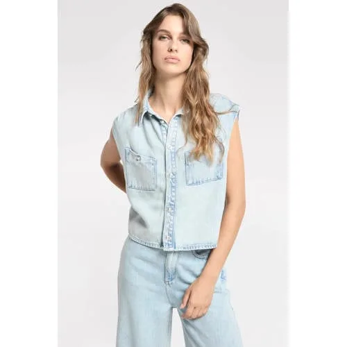 Geef je garderobe een frisse update met deze mouwloze light blue denim blouse van Homage to Denim. De lichte wassing en rechte pasvorm zorgen voor een relaxed silhouet dat prettig valt en makkelijk te combineren is met je favoriete jeans, rok of short. Gemaakt van 100% lyocell voelt de stof soepel en zacht aan op de huid, ideaal voor lichtere dagen in het voorjaar.Details die het verschil maken Mouwloos model, fijn voor warmere dagen of onder een vest of blazer Klassieke kraag en knoopsluiting voor een tijdloze, nette uitstraling Borstzakken aan de voorkant voor een casual denim look Rechtvallende pasvorm die losjes om het lichaam valt Effen light blue denim kleur, makkelijk te combineren Gemaakt van 100% lyocell voor een zachte, soepele touch Onderdeel van de Rebel collectie, met een stoere knipoog naar klassieke denim stylesVeelzijdig voor elke dagDeze blouse past net zo goed bij een zwarte skinny als bij een witte jeans of een luchtige linnen broek. Draag de blouse dichtgeknoopt voor een clean effect of open over een hemdje voor een meer ontspannen laagjeslook.Homage to DenimHomage to Denim brengt moderne items met een duidelijke inspiratie uit de denimwereld. De focus ligt op comfortabele pasvormen, herkenbare details en kleuren die je makkelijk in je dagelijkse outfits gebruikt. Zo voeg je moeiteloos een stoere, maar toegankelijke stijl toe aan je kledingkast.Een fijne blouse die snel een vaste waarde wordt in je lente en zomer outfits.