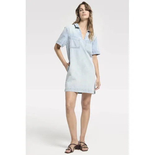 Deze lichtblauwe spijkerjurk van Homage to Denim, de denim shirt dress met v-hals, is een ontspannen basic voor elke dag. De jurk heeft het rechte silhouet van een overhemdjurk, gecombineerd met een vrouwelijke V-hals. De klassieke kraag en lichte wassing geven een frisse, tijdloze uitstraling die makkelijk te combineren is met je favoriete sneakers of laarsjes.Licht denim met doordachte details Gemaakt van stevig maar soepel denim, geschikt voor dagelijks gebruik Driekwart mouwen met rechte mouwinzet voor een rustige, moderne look Zonder sluiting, zodat de jurk in één beweging aangetrokken kan worden Klassieke kraag met V-hals voor een open halslijn Middellange lengte, ideaal te dragen met blote benen of een panty Twee borstzakken die de denimstijl extra benadrukken Effen light blue denim, makkelijk te stylen met kleurrijke accessoiresCasual denimstijl voor elke dagDe middellange spijkerjurk is geschikt voor veel momenten op de dag. Naar kantoor met een nette riem en enkellaarsjes, of juist casual met sneakers tijdens een vrije dag. Door de driekwart mouwen kun je de jurk lang doordragen, van frisse lentedagen tot zachte nazomeravonden.Homage to DenimHomage to Denim draait om denim met een comfortabele pasvorm dat er verzorgd uitziet. De ontwerpen zijn geïnspireerd op klassiek jeanswear, maar dan met een eigentijdse pasvorm en draagbare details. Zo haal je items in huis waar je vaak en met gemak naar grijpt.Een veelzijdige denimjurk die je garderobe op een ontspannen manier compleet maakt.