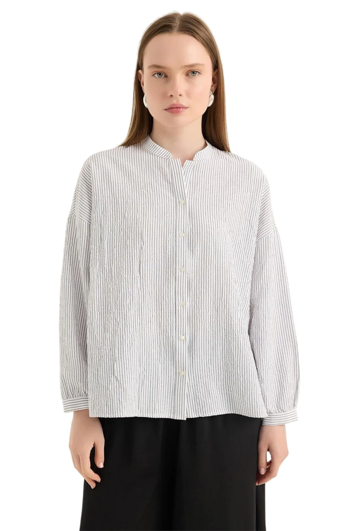 Blouse type: Klassieke blouse; Design: Gevoerde zoom/rand; Type sluiting: Knoopsluiting; Materiaal: Katoen; Motief: Gestreept; Kraag: Zonder kraag; Extra's: Lichte stof; Pasvorm: Normale pasvorm; Armlengte: Lange mouw; Lengte: Normale lengte