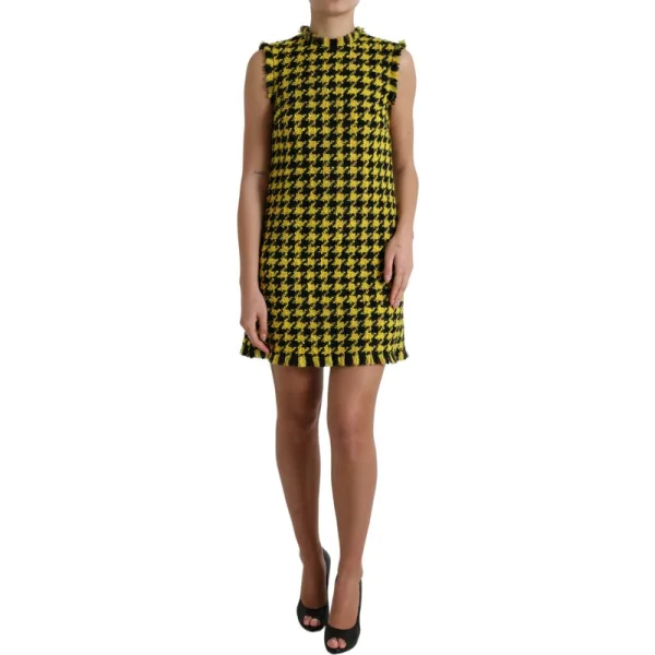 Verhoog, voer uit, betover in deze prachtige mini-jurk in houndstooth. Gemaakt van luxueuze tweed in een levendig geel en zwart ruitpatroon, flattert de moeiteloze shift-silhouette met een licht getailleerd ontwerp. De unieke rafelige zoom voegt een onderscheidende, moderne touch toe, waarmee je zeker opvalt. Deze mouwloze jurk biedt een chique, verfijnde uitstraling, perfect voor cocktailfeesten, speciale evenementen of het toevoegen van mode met een hoog niveau aan je dagelijkse stijl. Omarm tijdloze elegantie met een hedendaagse rand.