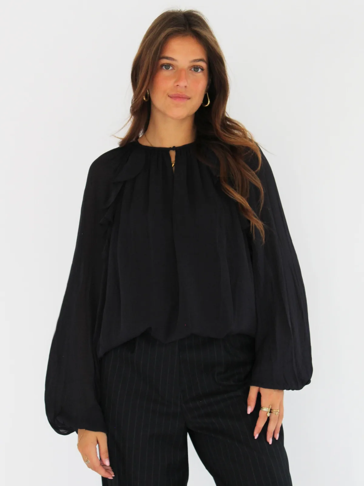 Blouse type: Blouseshirt; Materiaal: Viscose; Motief: Effen; Kraag: Zonder kraag; Details: Volant; Pasvorm: Normale pasvorm; Armlengte: Lange mouw; Lengte: Normale lengte