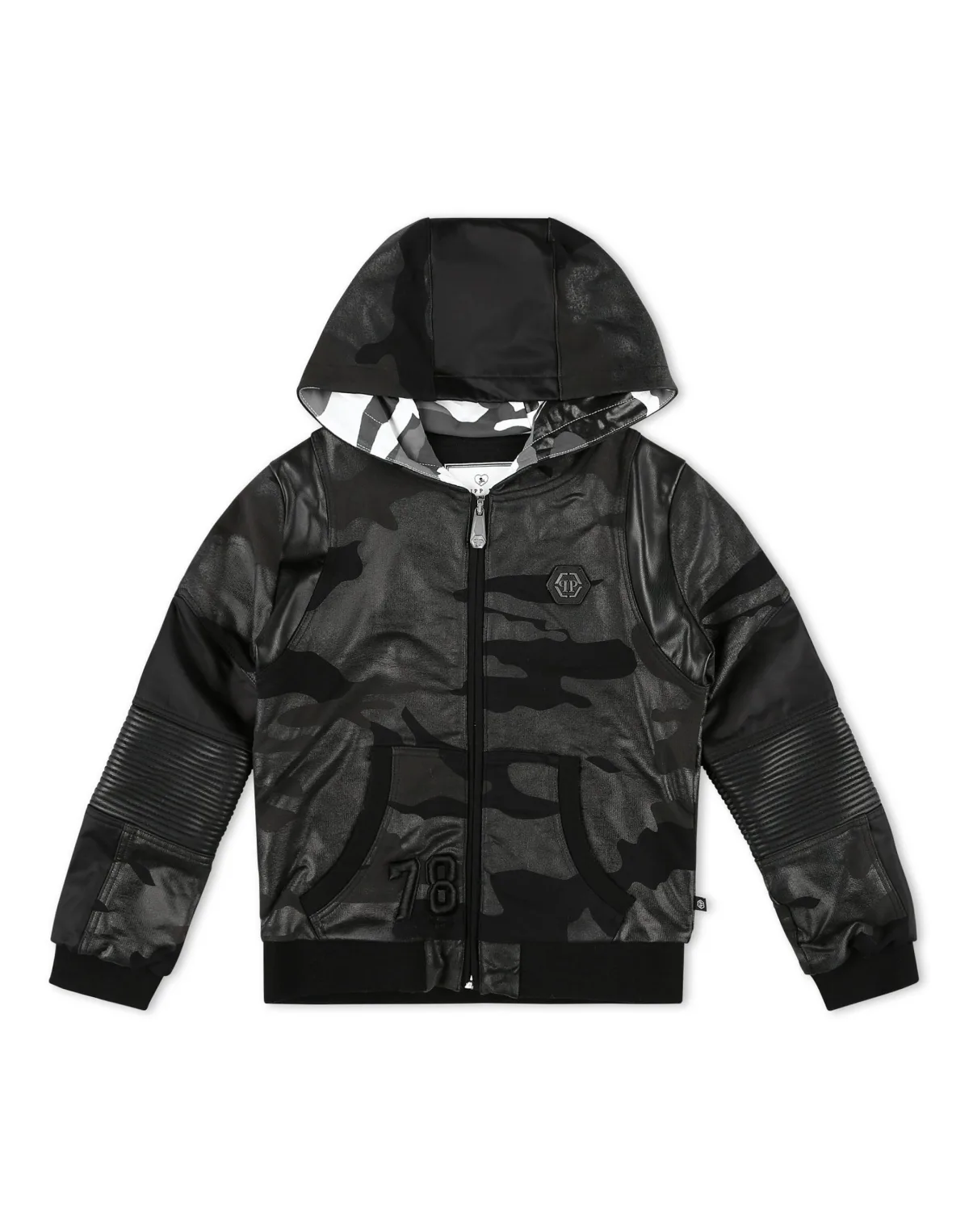 This camouflage cotton fleece hooded jacket is decorated with matelassé nylon inserts and quilted faux-leather. The saffian leather PP Hexagon is sewn at left chest. Zipper fastening and pouch pockets. Rib knit hems.