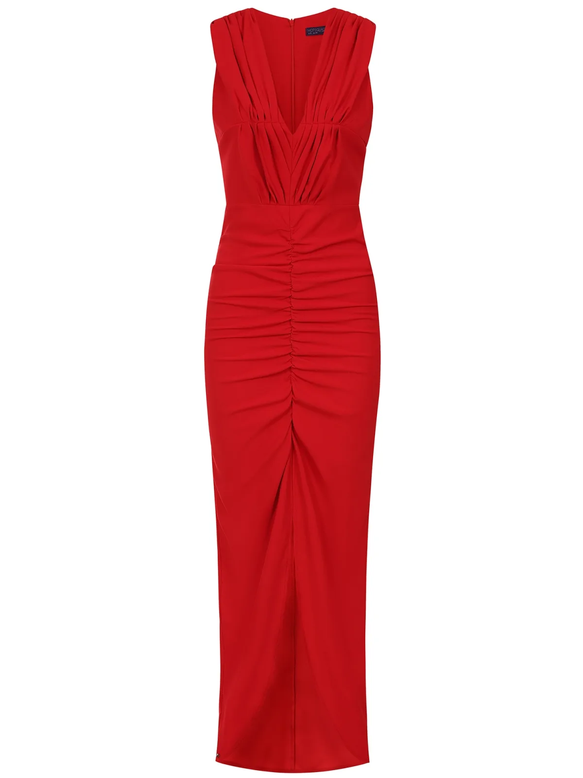 Design: Split, Rug rits; Type sluiting: Ritssluiting; Halstype: V-hals; Motief: Effen; Soort bandjes: Brede bandjes; Details: Plooien, Gedrapeerd; Extra's: Gladde stof; Lengte: Lang/maxi; Snit: Figuur omarmend; Pasvorm: Slanke pasvorm; Armlengte: Mouwloos