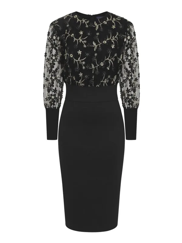 Type sluiting: Ritssluiting; Halstype: Ronde hals; Motief: Bloemenprint; Details: Borduursels, Gedrapeerd; Lengte: Knielengte; Pasvorm: Aansluitende pasvorm; Armlengte: Lange mouw