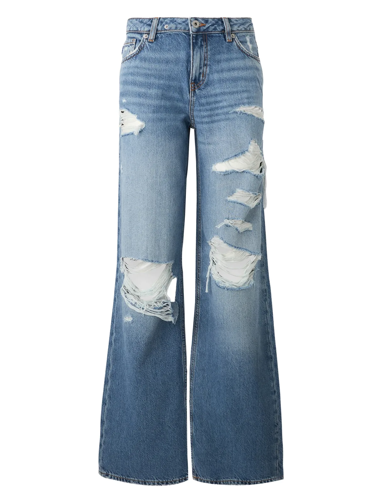 Design: Gevoerde zoom/rand, Ritssluiting, 5-pocket-style; Type sluiting: Knoopsluiting; Materiaal: Denim; Details: Cut-outs; Extra's: Op staal naden, Riemlussen; Wassing: ripped; Lengte: Lang/maxi; Pasvorm: Wide leg; Taillehoogte: High waist