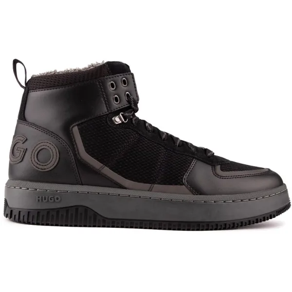 Maak kennis met de hi-top HUGO-trainer Kilian Hito met zijn retro basketbalkarakter. De designer sneaker combineert comfort, design en eenvoud. Een moderne variant op een traditionele hoge sneaker met een geheel zwart bovenwerk van premium gemengd materiaal, een gezellige enkelkraag van imitatiebont en een grote, tonale kenmerkende branding.