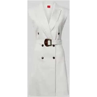 Dames kokerjurk van HUGO;Model 'Kamelana';Look: all-over motief/mêlee;pasvorm: smal;lengte: knielang;hals: V-hals;kraagmodel: reverskraag;Motief: krijtstreep;applicatie: labelapplicatie;Details: Gefixeerde schoudervullingen;Sluiting: knoopsluiting, riem;mouwvorm: zonder mouwen;Zoom: recht;Materiaalverwerking: twill;Materiaal: linnenmix