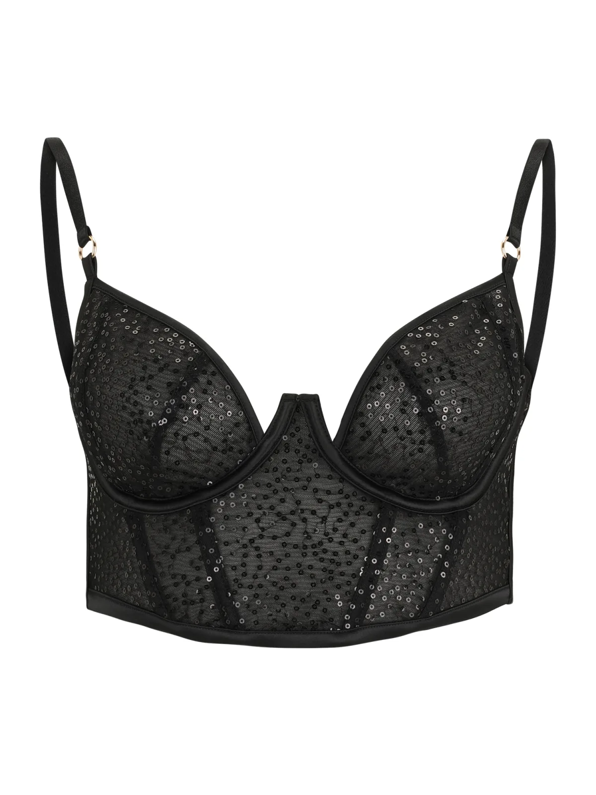 Cup soorten: Full cup bh; Soort bandjes: Normale bandjes; Bh/bikini type: Bustier; Beugel: Met beugel; Design: Ronde zoom; Type sluiting: Haakjes; Motief: Effen; Details: Pailletten; Extra's: Glitterend, Verstelbare bandjes
