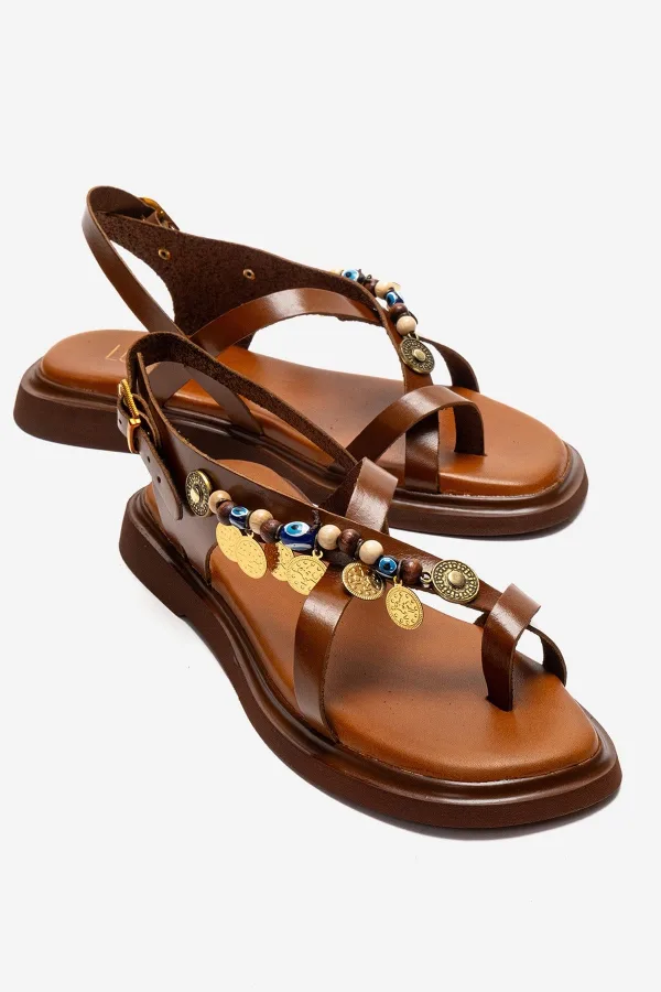 Een tijdloze teenpost-sandaal met verstelbare hielriem en ambachtelijke kralen- en metalen versieringen