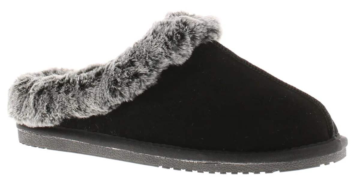 Zwarte Hush Puppies amara slippers voor dames, gemaakt van suède en een rubberen zool. Met: imitatiebontvoering, hiellus, rubberen zool en hush puppies-branding.