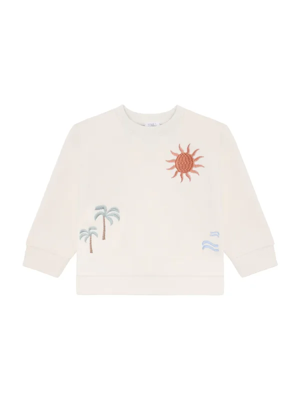 Specificaties: Hust & Claire Sweatshirt ‘Sejer Palms’ crème / pastelblauw / bruin / kreeft