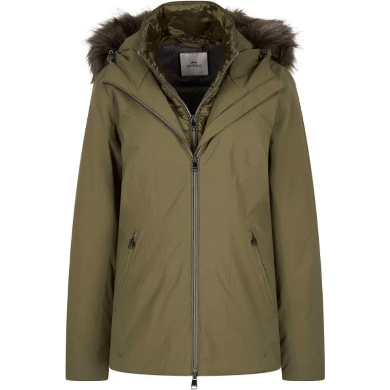 Elegante medium gewatteerde jas * Hoge kraag * Luxe bont rond de capuchon * Afneembaar binnenjack in parelglanzende stof * Verstelbare capuchon * Volledig getapete naden * Waterafstotend * Winddicht * 2-weg ritssluiting aan de voorkant * Merkritssluiters * Contrasterende voering * Fakedown label glanzend geprint aan de binnenkant van het jack op de voering * Fijne geribde binnenmanchetten * Kinbeschermer * Voorzakken met ritsen * Binnenzak met ritssluiting * HV Polo Logo geprint in metallic op de borst, linkerzijde van de drager * Zwarte metalen accessoires * Metallic paardenplaatje op de bovenmouw, linkerzijde van de drager 100% polyester, fake fur