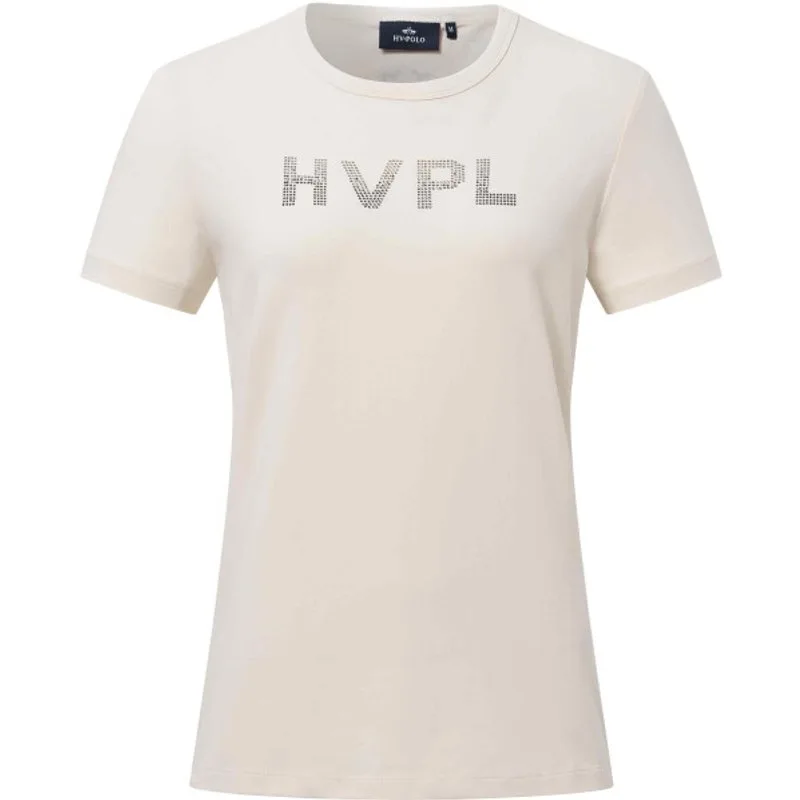 T-shirt met korte mouwen * Katoen-elastaan single jersey * Zacht materiaal * Maximaal draagcomfort * Ademend, zodat de lichaamstemperatuur altijd op hetzelfde niveau blijft * Elastaan stretch voor flexibiliteit en een perfecte lichaamsfit * Getailleerd model met afgeronde hals voor een vrouwelijke uitstraling * Groot HVPL artwork op de borst met strass-steentjes in twee verschillende kleuren * HV Polo metalen paardenlogo in zwart metallic aan de achterkant in het midden 95% Cotton 5% Elastane single jersey