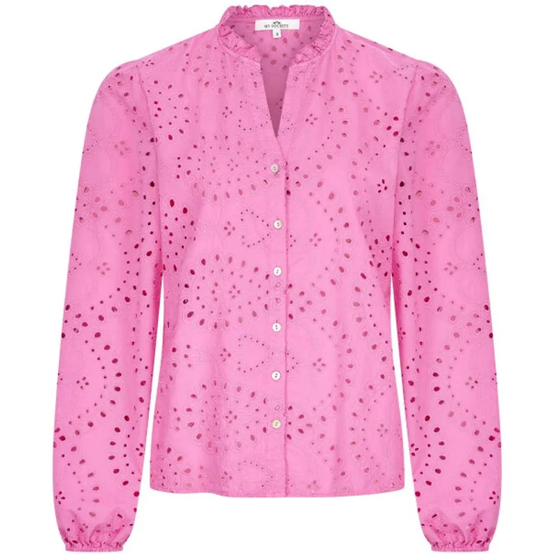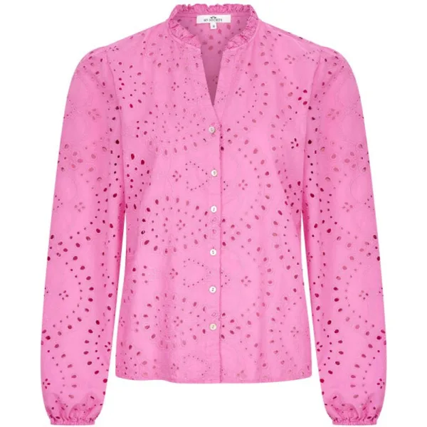 * Blouse in een broderie anglaise-stof * V-hals * Lange mouwen * Knoopsluiting aan de voorkant * Kleine ruches bij de hals * Kleine elastiek aan de binnenkant van de manchet 100% cotton