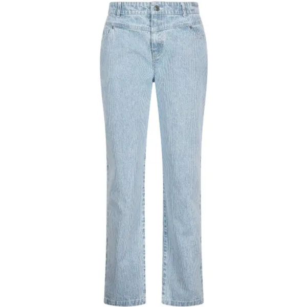 * 5-pocketmodel * Spijkerstof met klein blauw/wit streeppatroon * Voor- en achterpas voor mooie vorm * Branded jeans knoopsluiting met rits * Branded rivet op alle zakken * Strass rivet op voorzakken * Geborduurd artwork op de tailleband aan de achterkant * Riemlussen bij tailleband 99% cotton 1% elastan