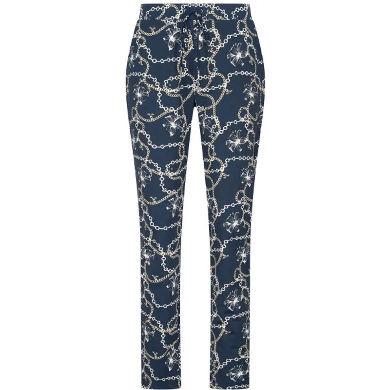 * Comfortabele broek in reiskwaliteit met allover print * Zakken aan de voor- en achterkant * Tailleband van dezelfde stof met elastiek aan de binnenkant * Koord van dezelfde stof in de tailleband * Merk metalen plaatje aan de voorkant 82% polyamide 18% elastane