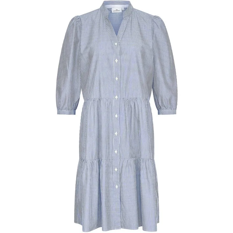 "Voel moeiteloos chique en stijlvol in onze nieuwe Lichtgewicht Garen geverfde Gestreepte Katoenen Jurk. De v-hals met kraagstaander en knoopsluiting aan de voorkant en manchetten voegen een vleugje verfijning toe, terwijl de kleine plooien bij de steken, manchet en mouwkop een flatterende silhouet creëren. Compleet met een metalen merkplaatje aan de achterkant van de nek, is deze jurk perfect voor elke gelegenheid. Upgrade vandaag nog je garderobe met dit must-have stuk!" 100% cotton