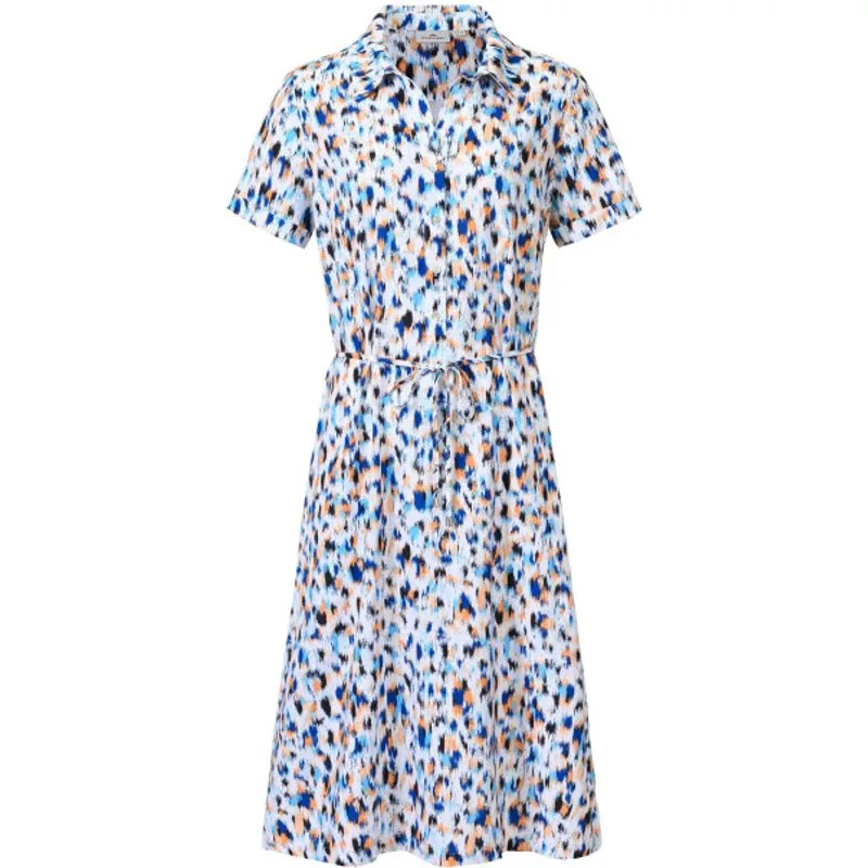 Linnen mix jurk met een kleurrijke all-over print of in blauw Indigo * Korte mouwen met omslagboord * Knoopsluiting aan de voorkant * Metalen merkplaatje aan de achterkant * Afneembaar koord in de taille 70% viscose 30% linen