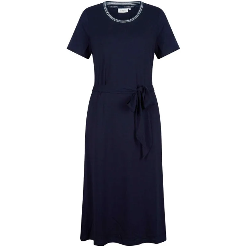 Jurk met een regular fit in stretch viscose jersey * Mid-lengte * Korte mouw * Fijne rib met sportieve streep rond de halslijn * Aparte riem van schelpenstof * Metalen plaatje aan de achterkant in het midden 95% viscose, 5% elastane