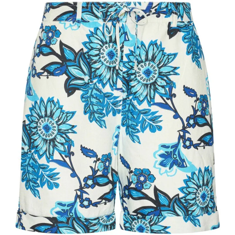 Linnen mix shorts met een kleurrijk all-over printje of in blauw Indigo * Koordje binnenin de tailleband * Contrastkleurig labeltje aan de voor- en achterzakken * Merkplaatje aan de linker voorzak * Rits- en knoopsluiting * Nepomgeslagen pijpjes met bandje aan de zijkant 70% viscose 30% linen